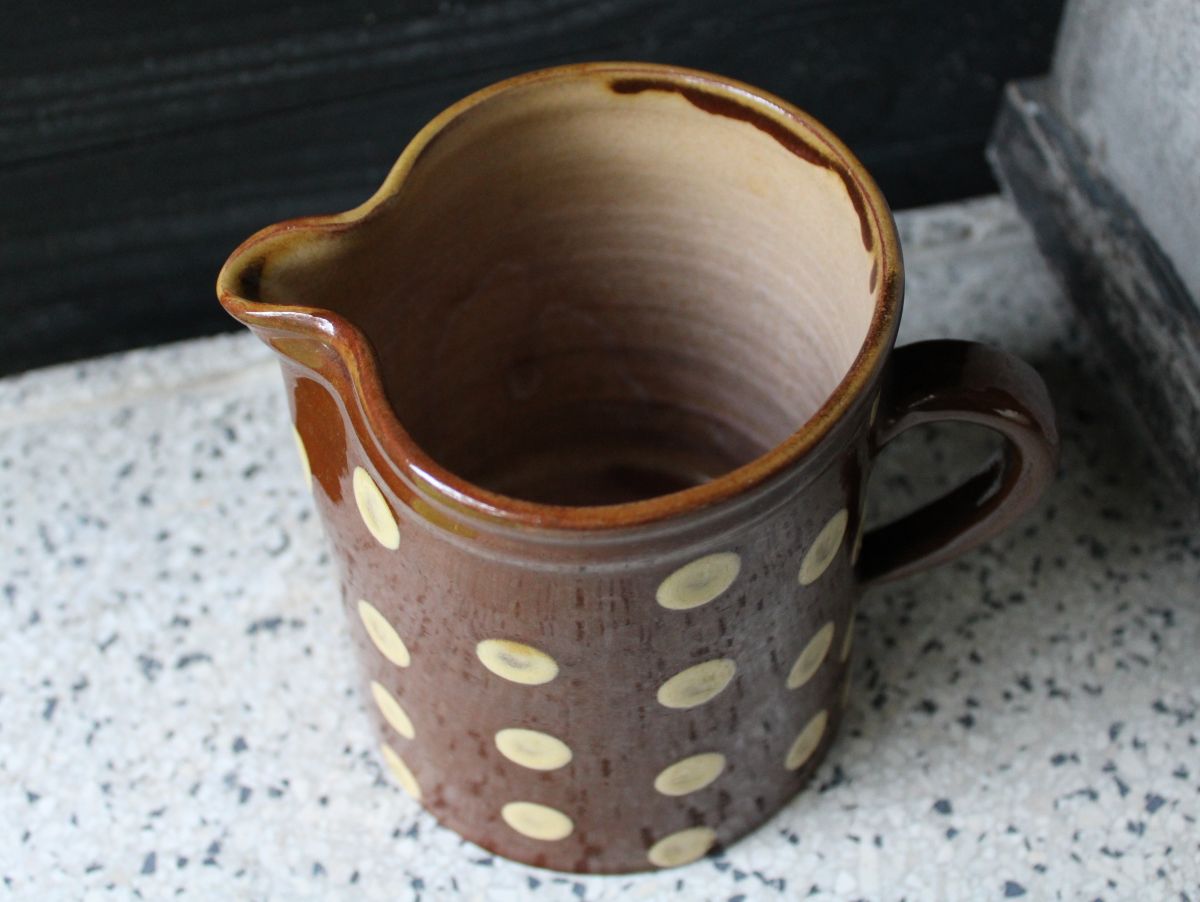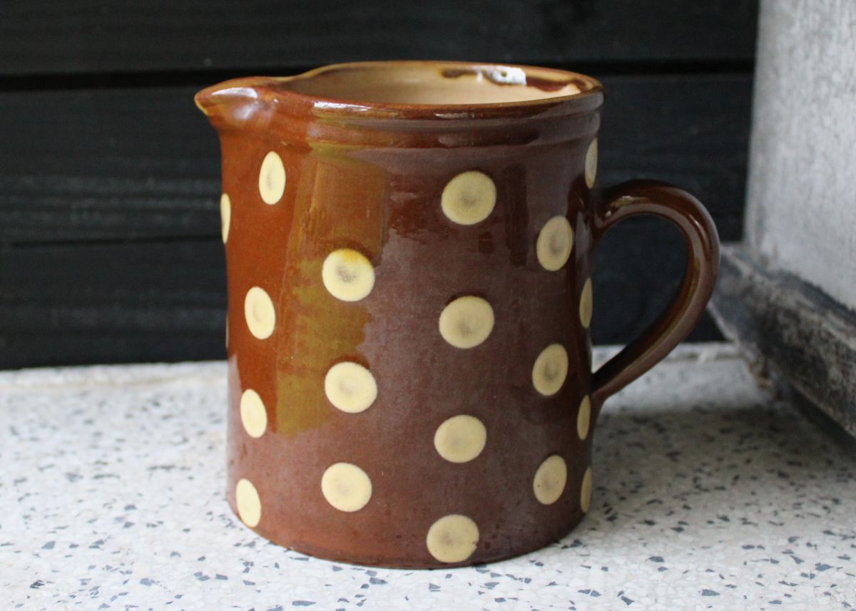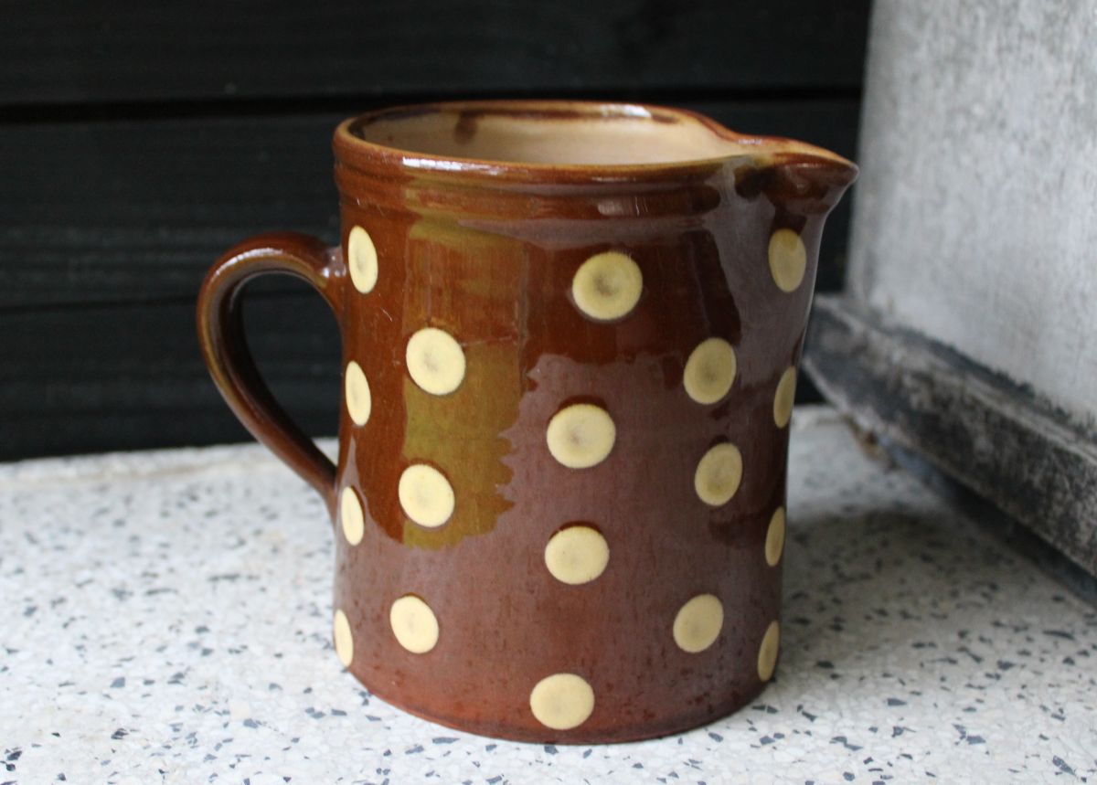 Prachtige Franse kan met stippen. Terracotta aardewerk. In goede staat. Hoogte 12,5 cm. Diameter bordem: 11 cm.