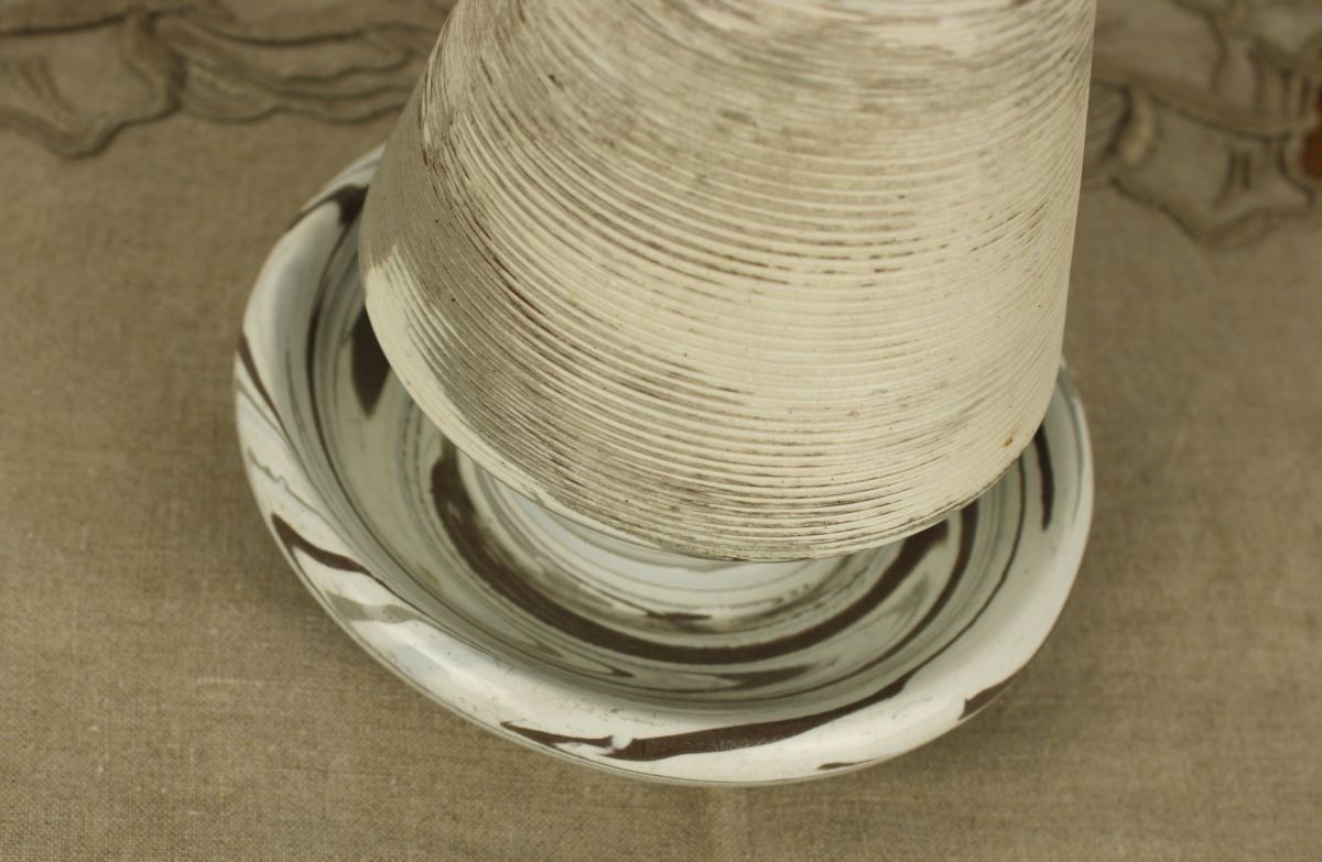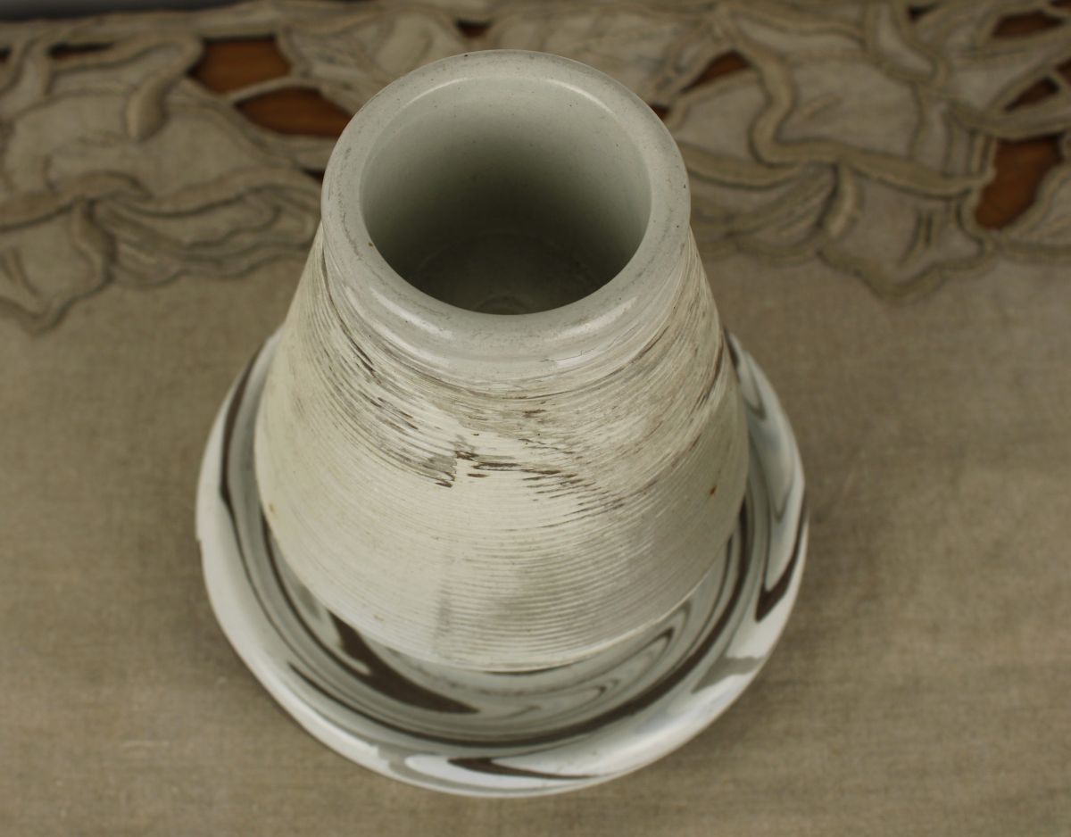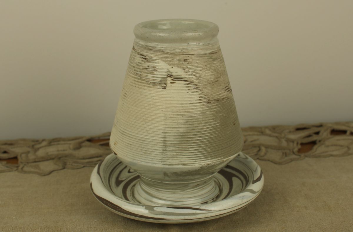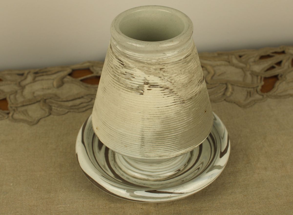 Mooie oude Franse pyrogene. Deze strijkers voor lucifers stonden vroeger in het cafe. Om je lucifers langs te strijken. Met de huidige lucifers werkt dat niet meer, dus nu zijn ze louter decoratief. Mooi zwaar, dus ook leuke paperweight op je bureau bijvoorbeeld. Superdecoratief. Deze is mooi groot en heeft een soort marmerdecor. Het is gemaakt van keramiek. In goede staat. Diameter schotel: 13,5 cm. Hoogte: 14 cm.