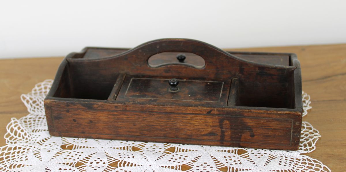 Mooi oud houten schrijfkistje met vakjes voor pennen en ander schrijfgerei. De twee open vakjes waren voor inktpotjes. Wat vlekjes, waarschijnlijk van inkt, maar dat maakt hem alleen nog leuker. Het is een klein kistje. 20 x 11 cm.