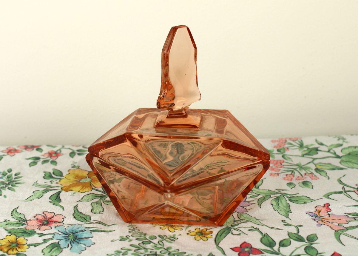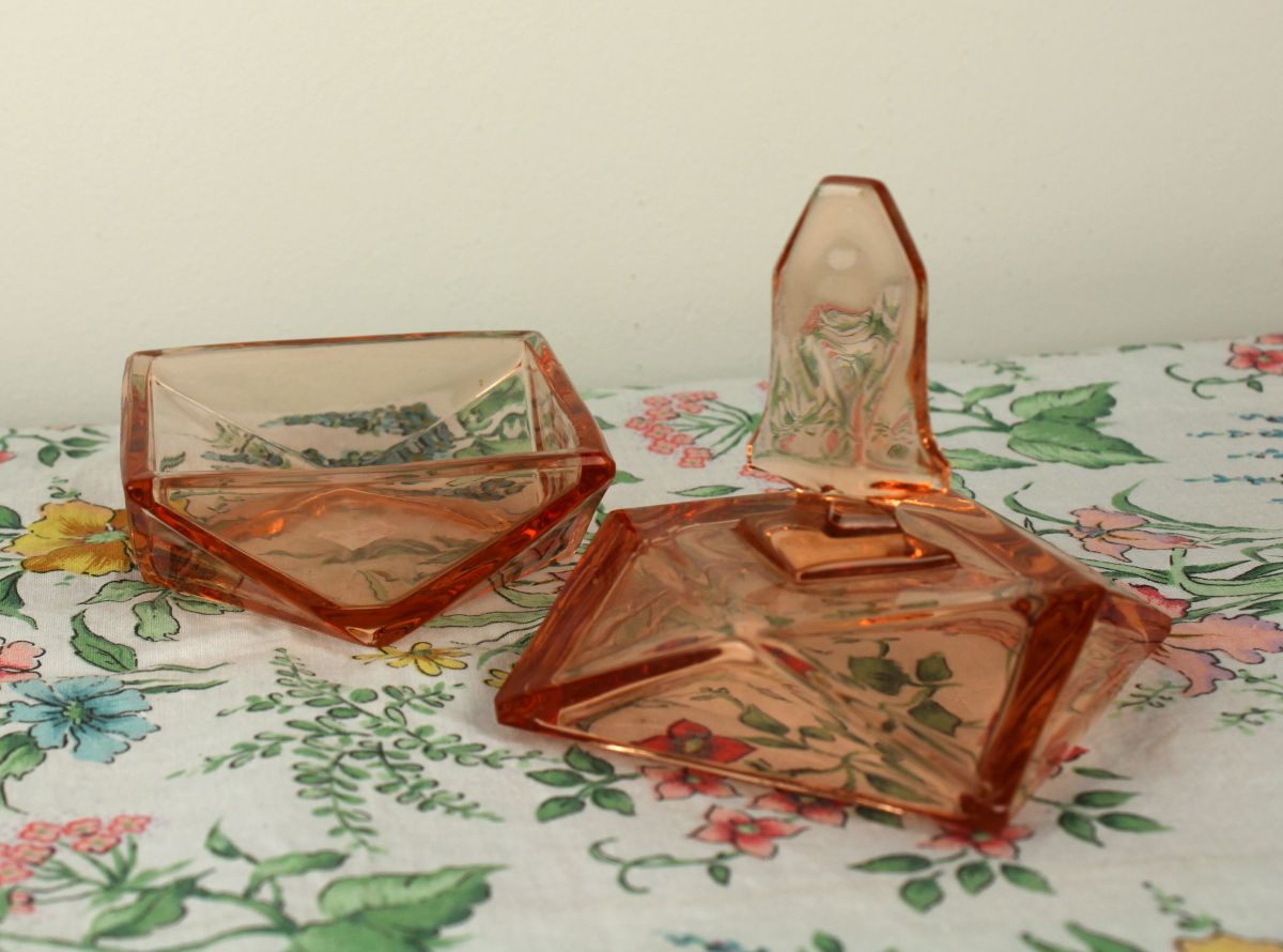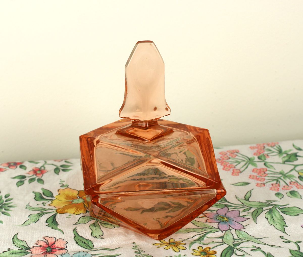 Mooie art deco persglazen fles in roze met deksel. In goede staat. 8 x 8 cm. Hoogte met deksel: ruim 11 cm.