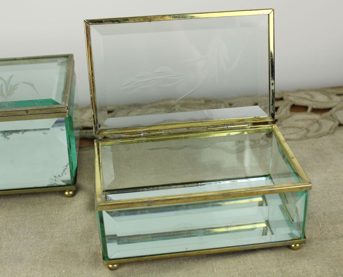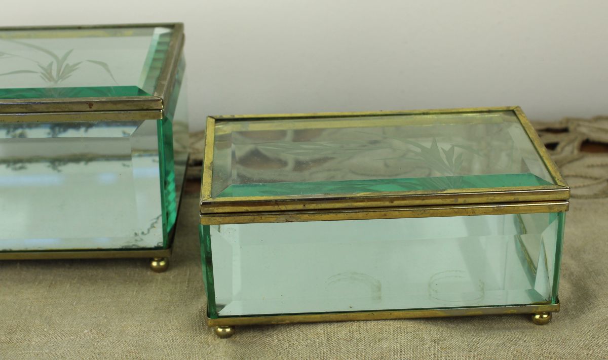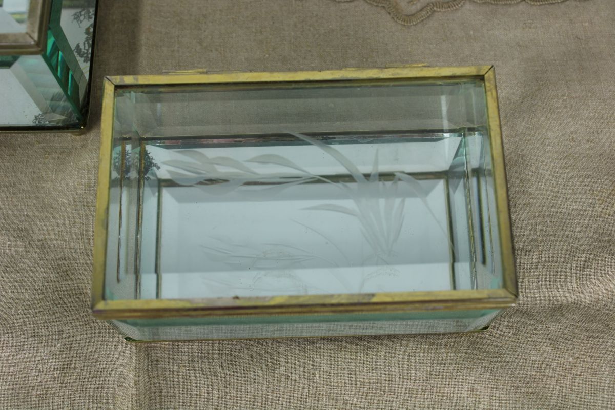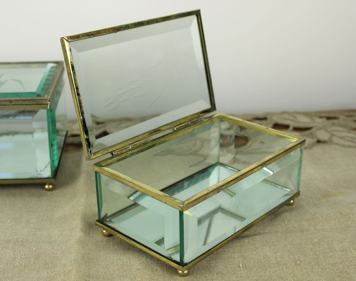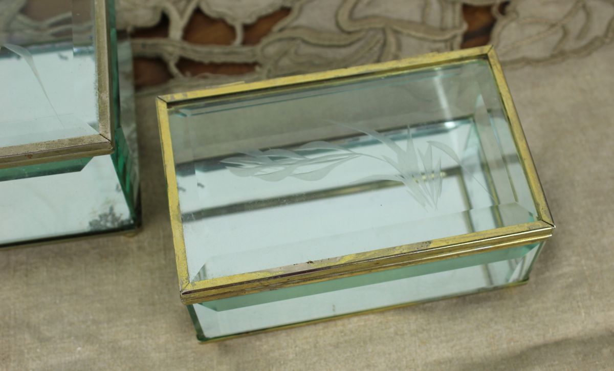 Mooie gegraveerde glazen doos, veelal gebruikt voor sieraden. Met messing rand. Wat gesleten, maar het glas is intact. Op bolpootjes. 13 x 8 x 5,8 cm.