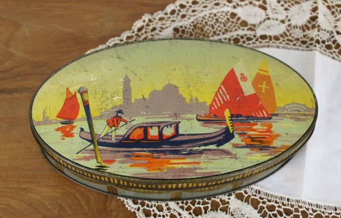 Oud blik, 1930s, van Sharp & Sons England. Waarschijnlijk voor toffees. Met afbeelding van Venetië. In nette staat. Wat verkleurd, wat krasjes, maar nog erg mooi. Sluit goed. Zie foto's voor een goede indruk. 22,5 x 12,5 x 4,7 cm.