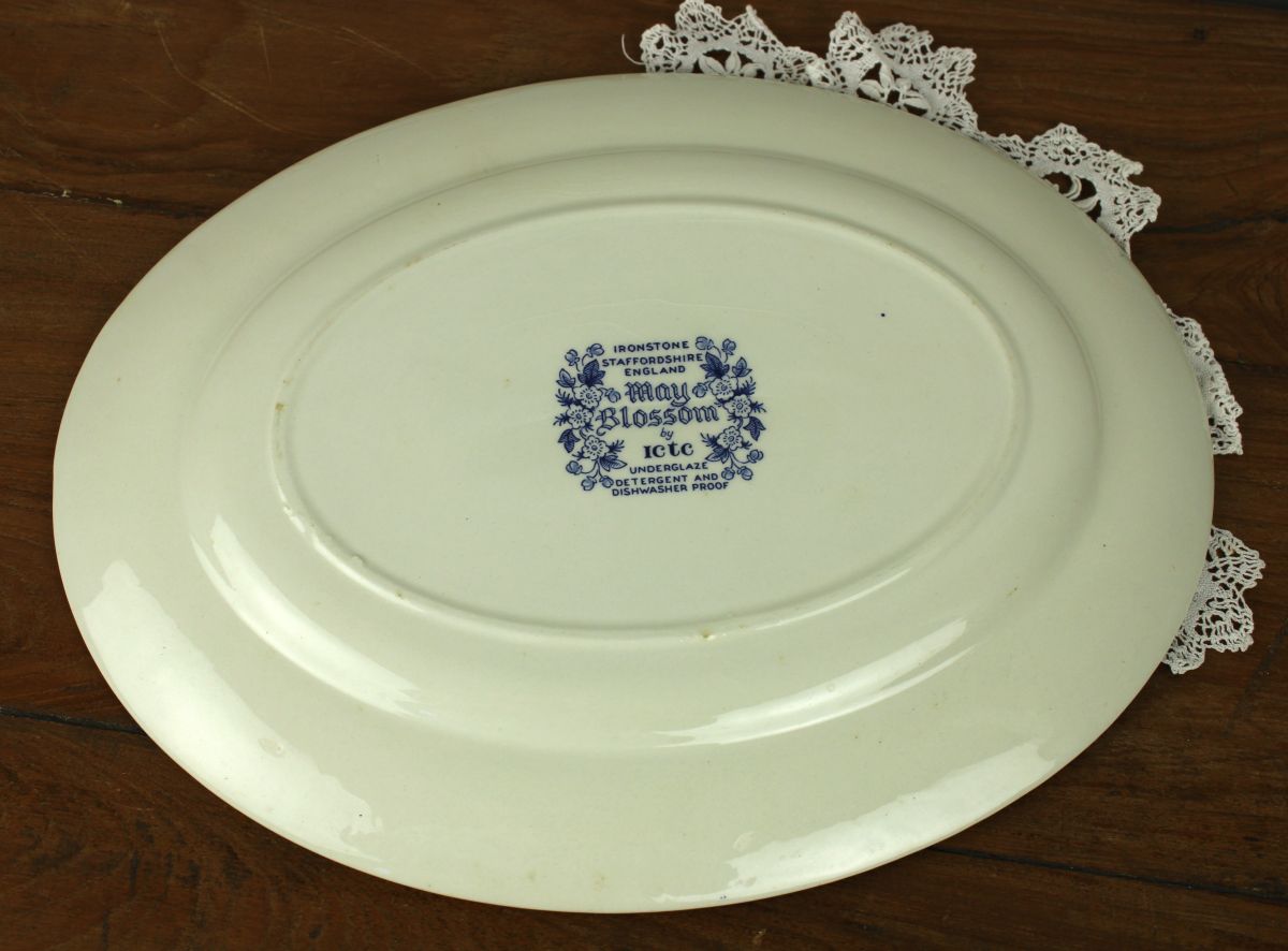 Prachtig servies, dit Engelse servies met decor: May Blossom. Niet superoud, wel supergezellig! Deze schaal meet 31 x 24,5 cm.