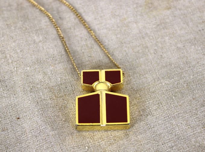 Vintage ketting van Guy Laroche met parfum fles. Verguld met rood. Je kunt op de achterzijde je favoriete parfum spuiten. Heb je je favoriete luchtje ook aan je ketting. Goede staat. Jaren 80 - 90. 2,3 cm breed, 3,1 cm hoog en 7 mm diep.