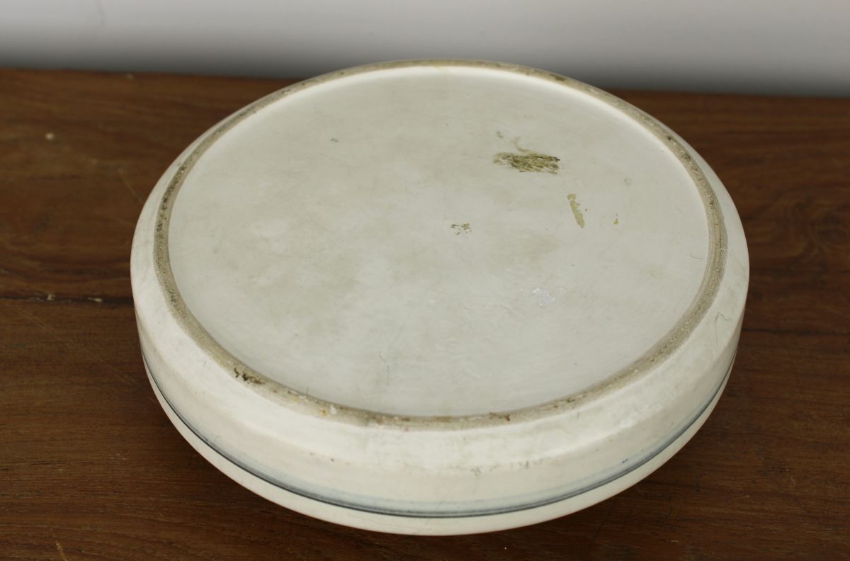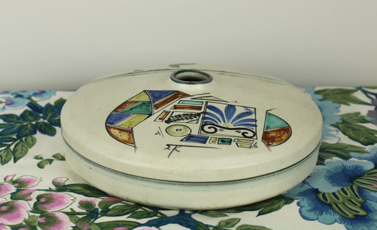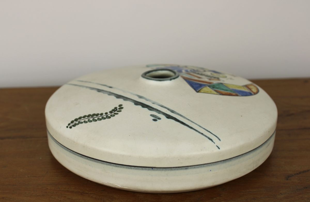 Vaas, geinspireerd op de Japanse bloemsierkunst. Met oase zet je er een paar kleine takjes in. Heel eenvoudig, maar erg mooi. Waarschijnlijk is deze vaas in Frankrijk gemaakt. Diameter: 17 cm. Hoogte: 5,5 cm.