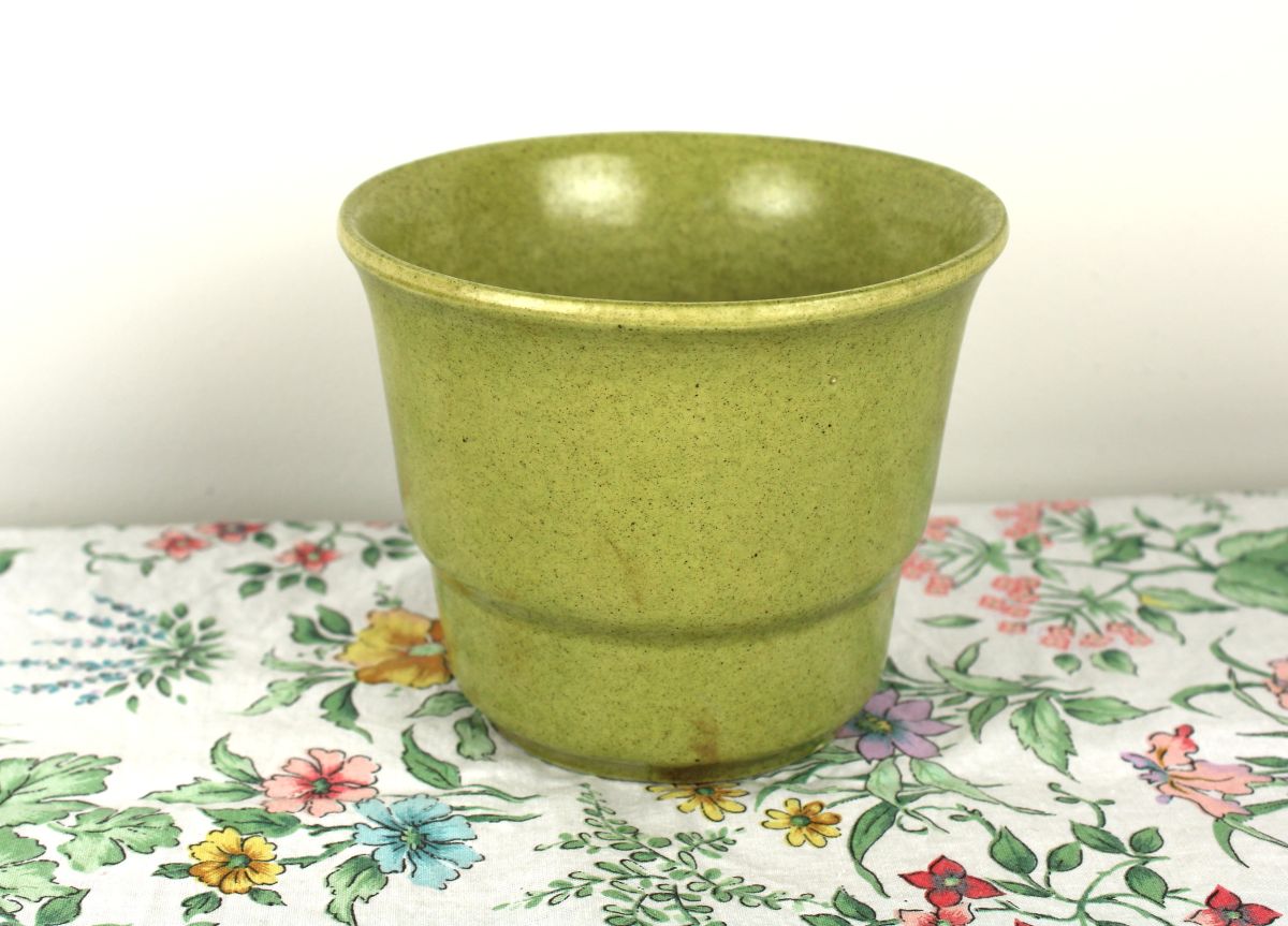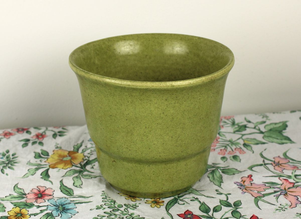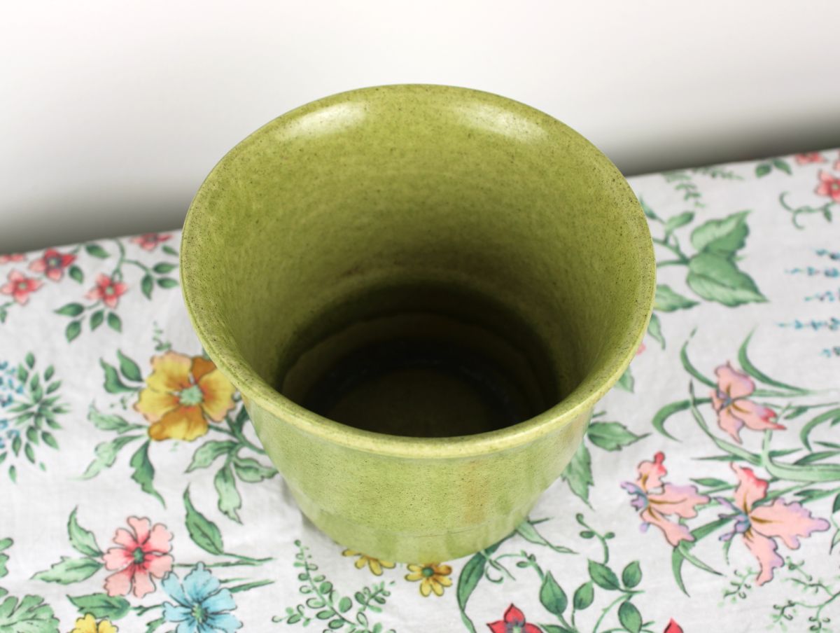 Mooie bloempot in lindegroene kleur. Waarschijnlijk Jaren 50. Wat verkleuring, maar dat komt ook door het matte glazuur. Erg mooi. Hoogte 10,5 cm. Diameter bodem: 7,5 cm. Diameter bovenrand: 13 cm.