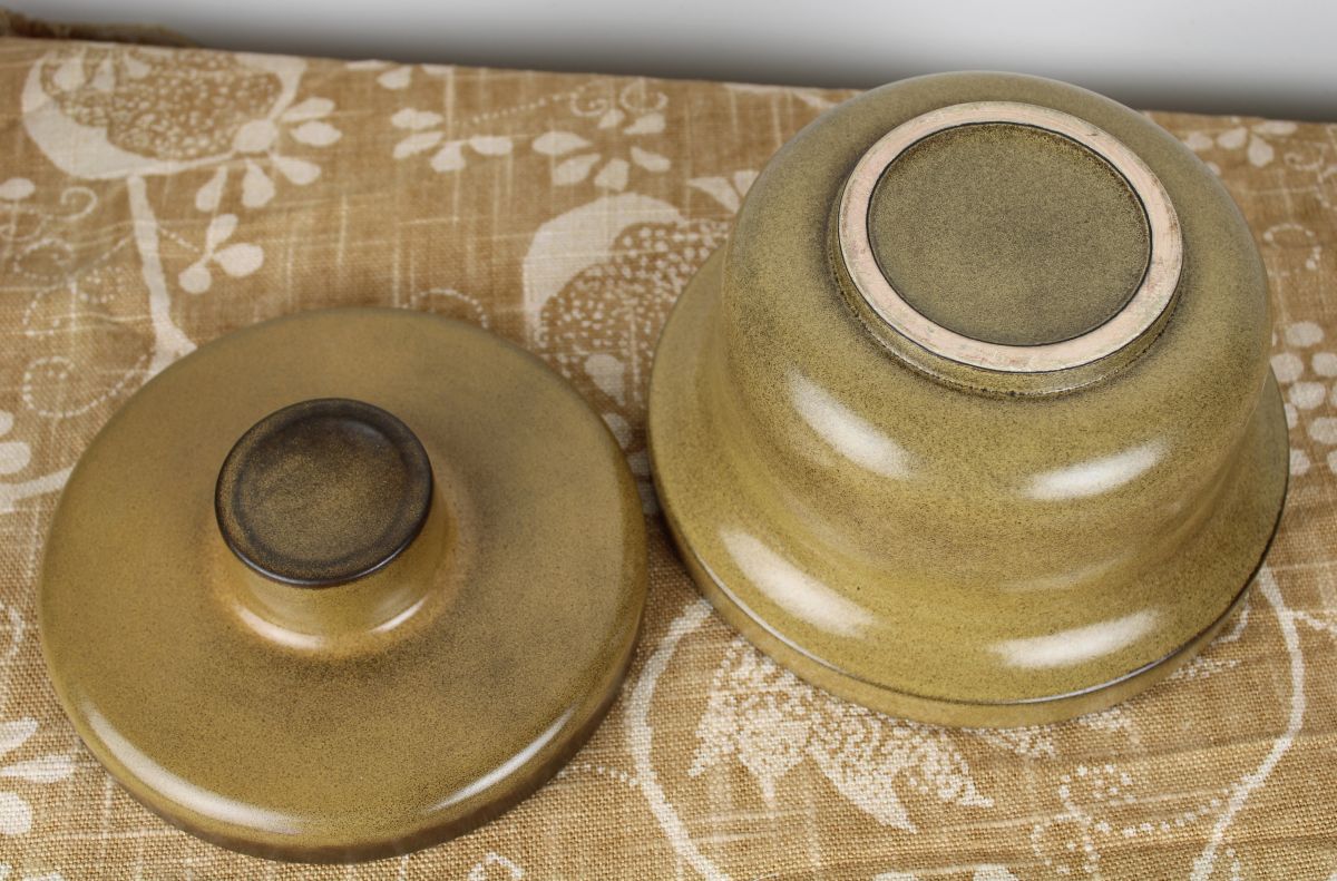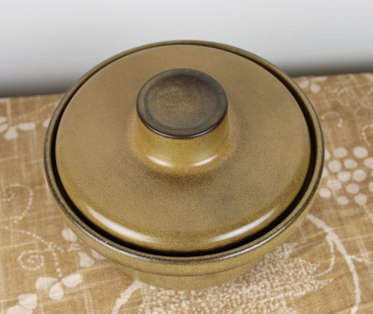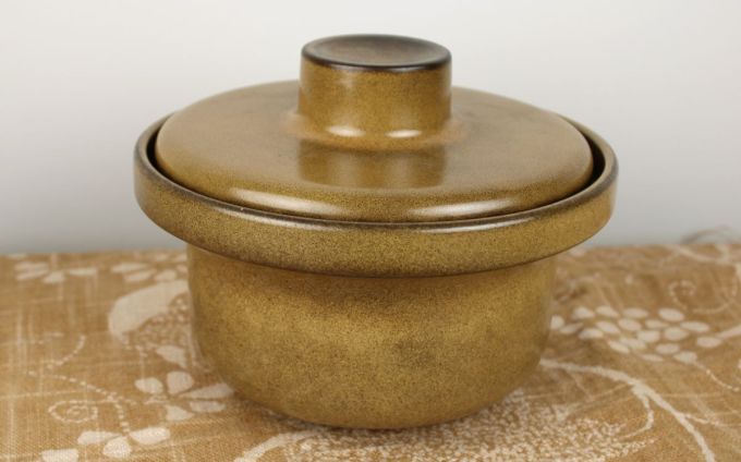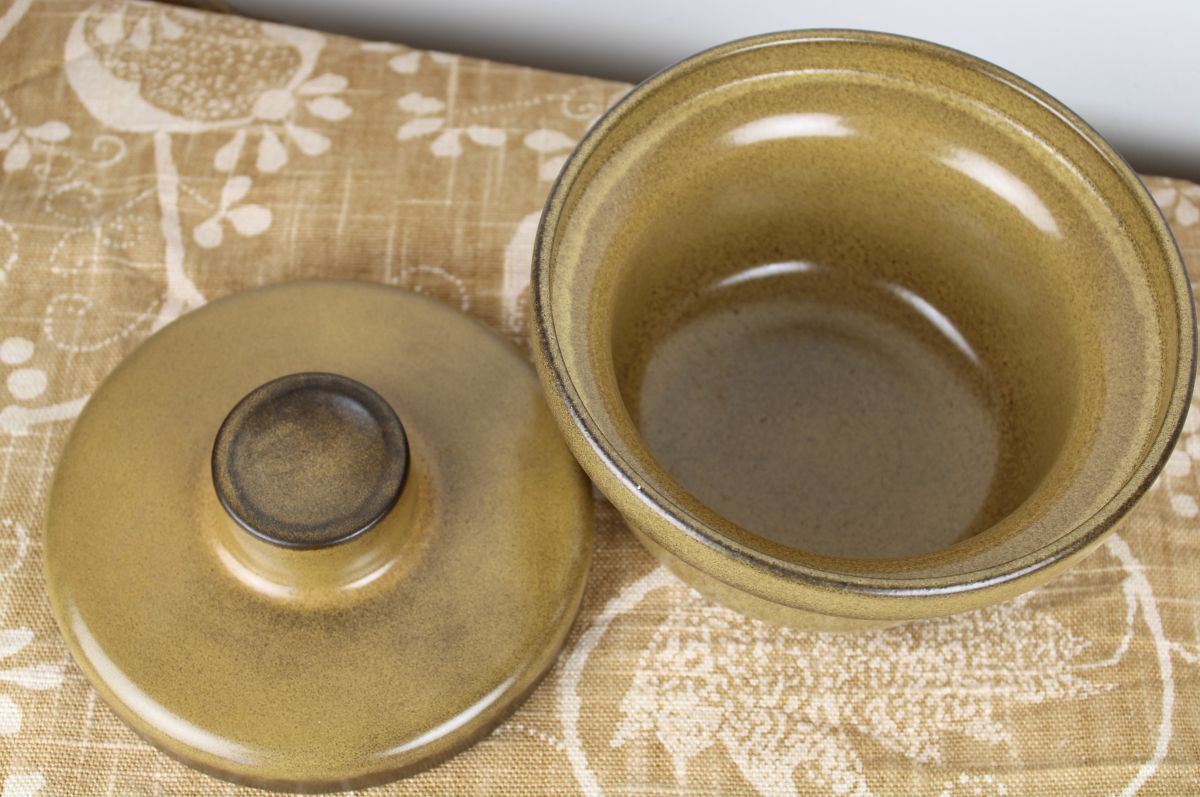 Vintage jaren 60/ 70 dekschaaltje in mooie lichtbruine kleur. Tof in je vintage keuken! Goede staat. Diameter ongeveer 18 cm.