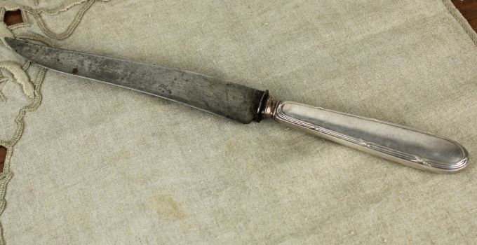 Prachtig groot mes met verzilverd heft. Supermooi en na goed slijpen en schoonmaken ook te gebruiken. Lengte; 30,5 cm.