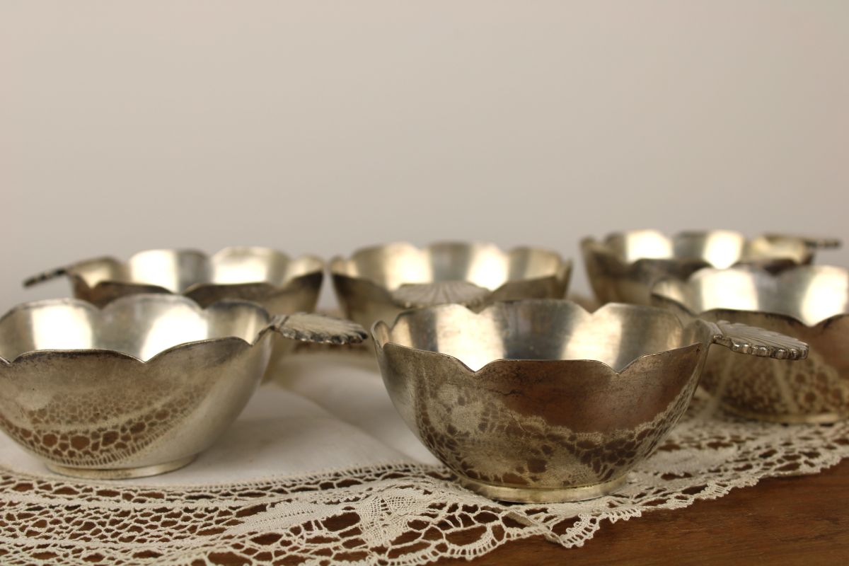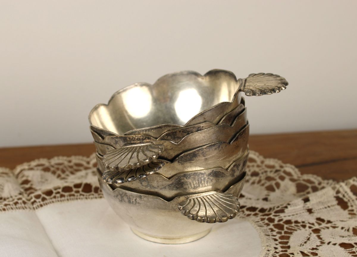 Hele mooie verzilverde schaaltjes met als handgreep een schelp. Ze zijn gemerkt Cornet France. In nette, maar gebruikte staat. Slijtage van het zilver. Toch nog steeds prima bruikbaar en erg mooi en zwaar van kwaliteit. Diameter zonder handvat 9 cm.Hoogte 4 cm. De prijs is per stuk.